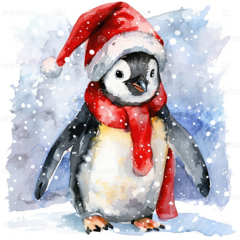 Очаровательный пингвин, одетый в праздничную красную шляпу и шарф, стоит в снежном зимнем пейзаже, окруженном падающими снежинками, создавая веселую и причудливую атмосферу праздника