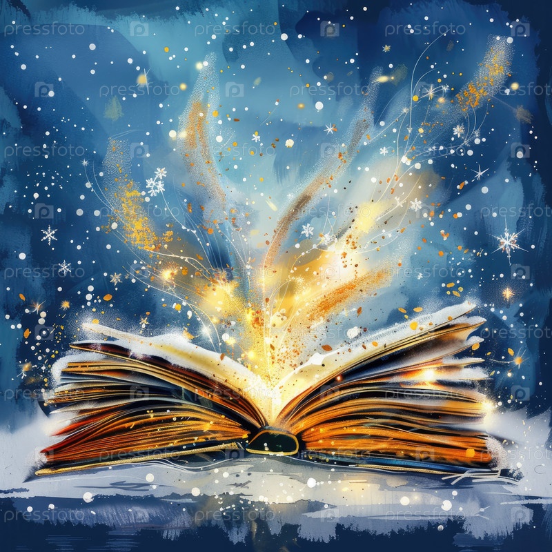 Очаровательная иллюстрация открытой книги, излучающей свет и магию, с светящимися страницами и мерцающими звездами в глубоком голубом ночном небе, создавая странную и сказочную атмосферу
