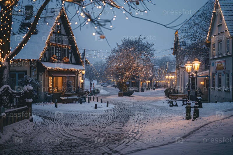 Заснеженная деревенская улица на закате с очаровательными домами, украшенными праздничными огнями, создает теплую атмосферу