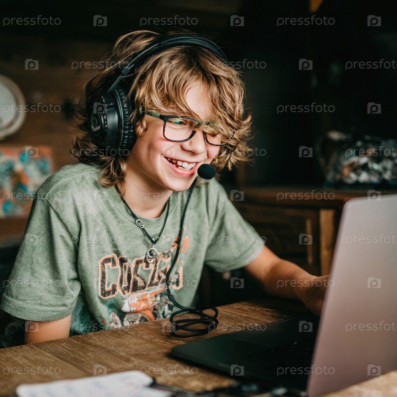 Мальчик с очками и наушниками улыбается, играя в видеоигры на ноутбуке в теплой, гостеприимной домашней обстановке, демонстрируя веселый и увлекательный гейминг-опыт
