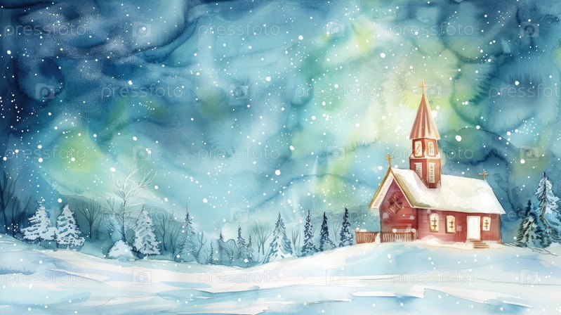 Очаровательная красная церковь стоит в безмятежном зимнем пейзаже, окружена снежными деревьями под звездным небом, создавая мирную и магическую атмосферу праздничного сезона