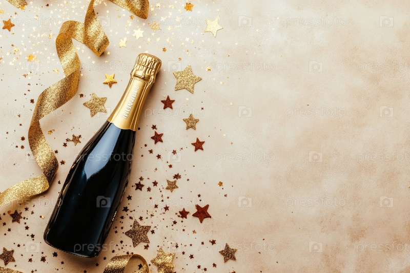 Бутылка шампанского изящно расположена с золотой ленточкой и рассеянными праздничными звездами на текстурированном фоне, создавая праздничную атмосферу, идеально подходящую для особых случаев и мероприятий