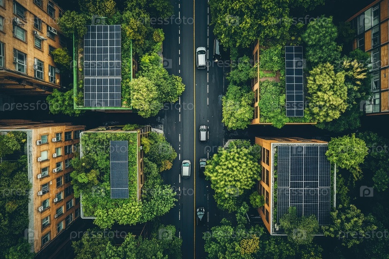 Воздушная перспектива современного городского района с пышно-зелеными деревьями и солнечными батареями на крыше, подчеркивая интеграцию природы и технологий в градостроительство и устойчивую жизнь
