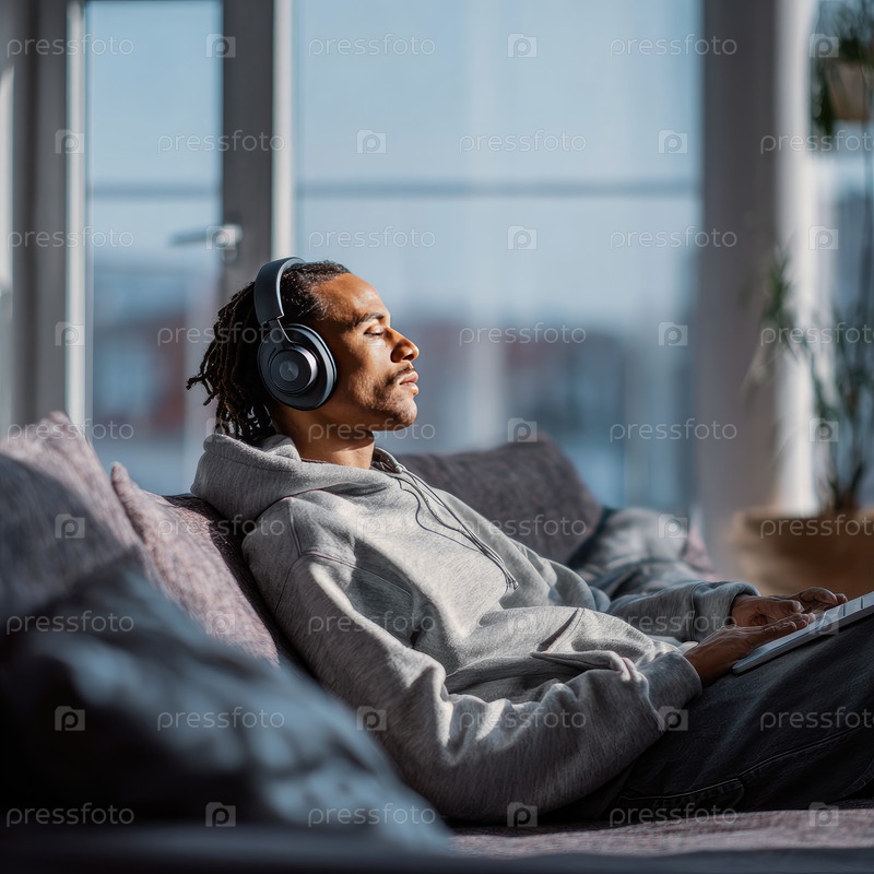 Афроамериканец с наушниками наслаждается музыкой, сидя на удобном диване в светлой гостиной, окруженный естественным светом и расслабленной атмосферой