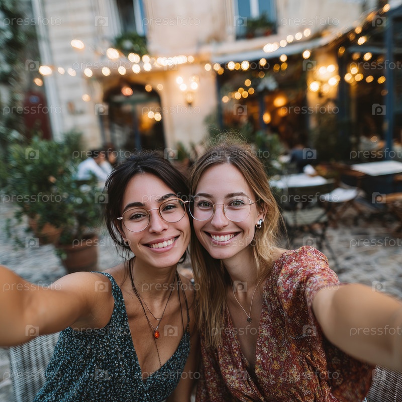 Две веселые женщины делают селфи в очаровательном открытом кафе, окруженном теплыми лампами и пышной зелени, создавая яркую атмосферу для социальных встреч