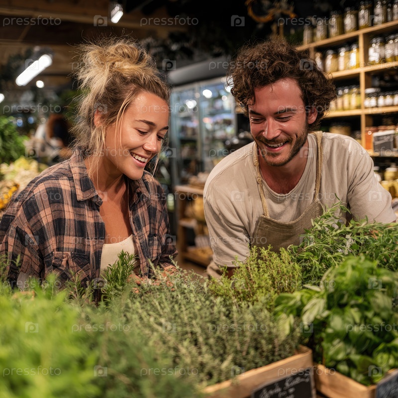 Улыбающиеся женщины и мужчины исследуют свежие травы на оживленном рынке, окруженные обилием зелени и естественным светом, создавая теплую и привлекательную атмосферу