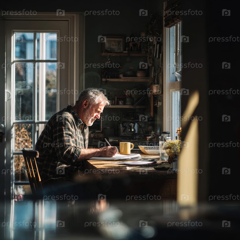Пожилой человек с седыми волосами сосредоточен на написании за деревянным столом в уютной кухне, освещенной солнечным светом, проходящим через окно, создавая теплую и гостеприимную атмосферу