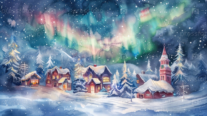 Живописная зимняя деревенская сцена с очаровательными домами, покрытыми снегом, освещенными красочными северными огнями, танцующими в ночном небе, создавая магическую и спокойную атмосферу