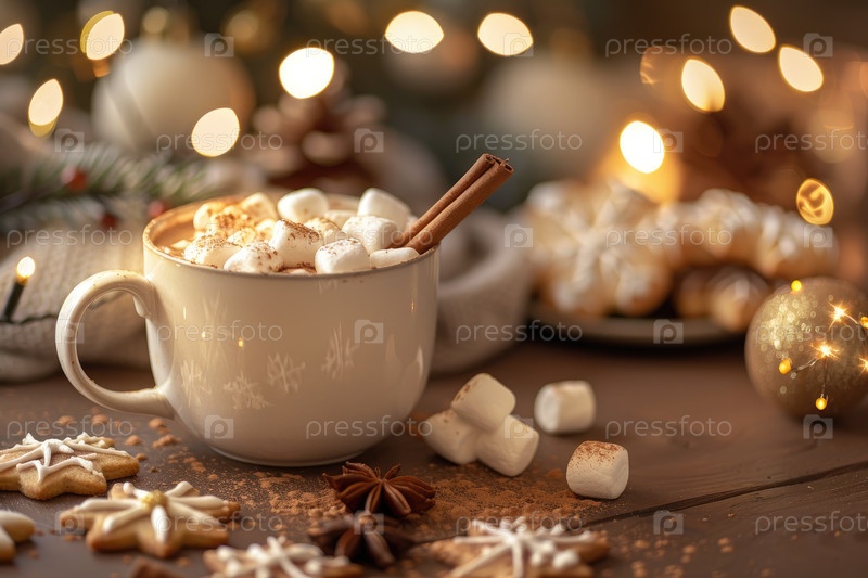 Теплая чашка горячего шоколада с пушистыми зефирами и палочкой из корицы сидит на деревянном столе в окружении праздничных украшений, печенья и мягкого боке, создавая уютную атмосферу