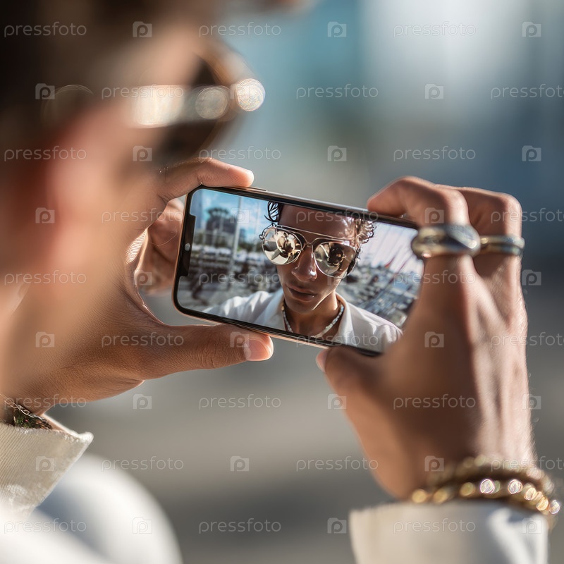 Молодой человек в стильных солнцезащитных очках делает селфи на своем смартфоне с яркой мариной на заднем плане, демонстрируя оживленную атмосферу и современный образ жизни