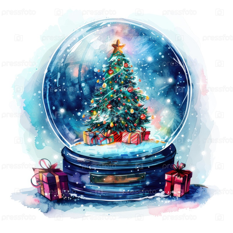 Яркая рождественская елка заключена в стеклянный снежный шар, окруженный красочными подарками и сверкающими украшениями, создавая волшебную зимнюю атмосферу, наполненную праздничным настроением