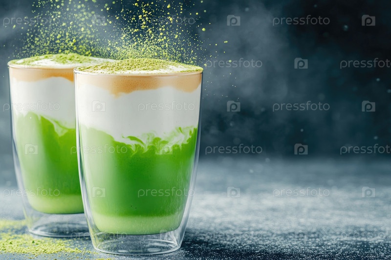 Латте матч, подаваемый в прозрачных стеклах, демонстрирует кремовую пену и ярко-зеленые слои, создавая привлекательную сцену напитка с текстурированной поверхностью и намеком на порошок мача в воздухе