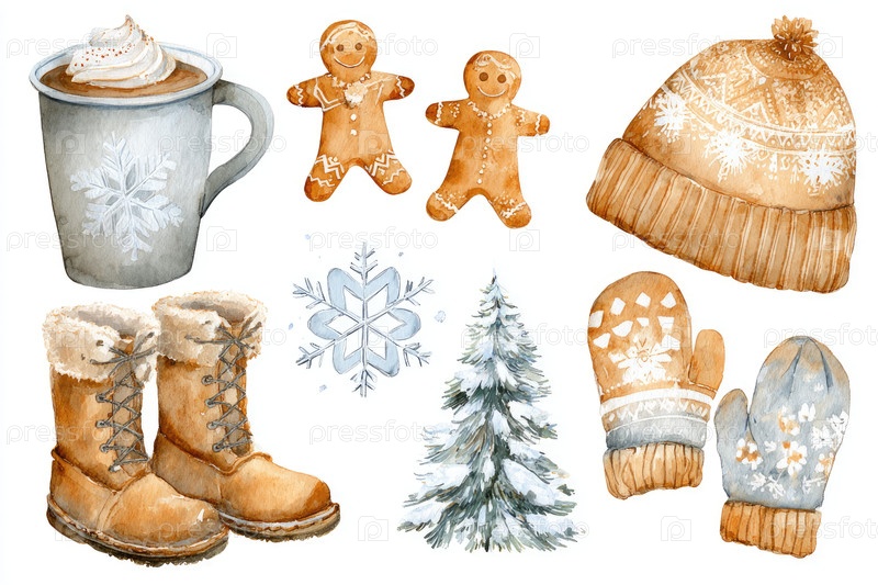 Уютная зимняя иллюстрация с горячим шоколадом, пряничным и теплыми аксессуарами для сезонных вибраций