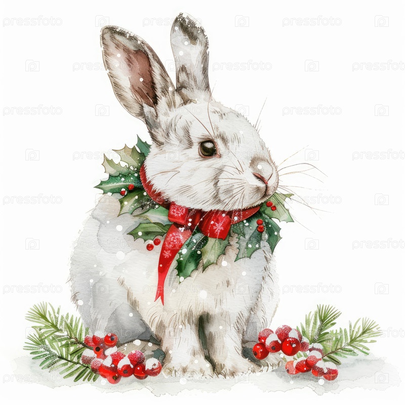 Белый кролик в праздничном венке и красный лук, окруженные зимней зеленью