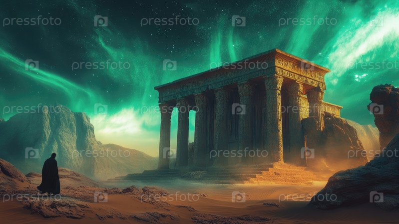 Таинственный древний храм под яркими полярными сияниями в сюрреалистическом пустынном пейзаже ночью