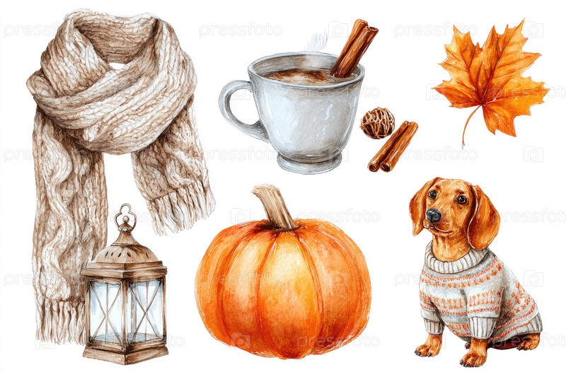 Уютная осенняя иллюстрация с теплым шарфом, тыквой, собакой и сезонными элементами