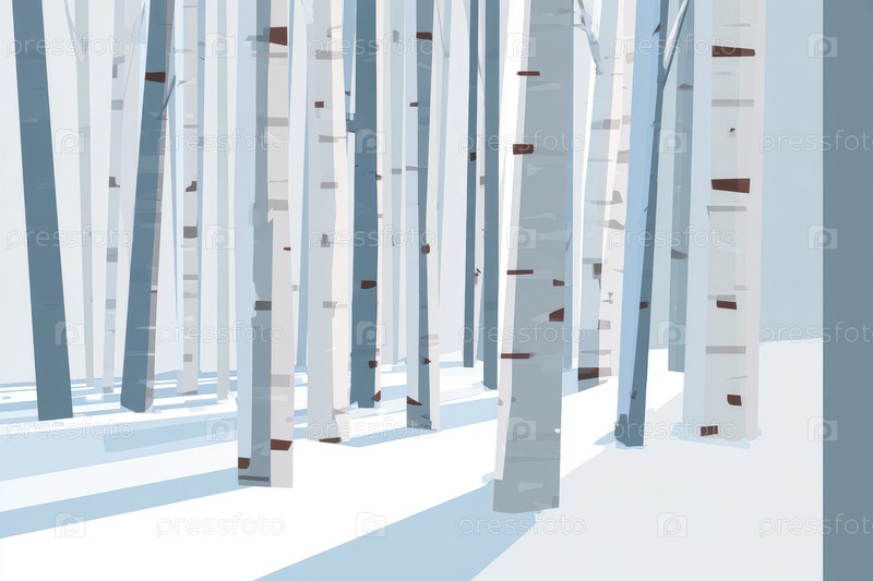 Минималистская иллюстрация спокойного зимнего леса с высокими белыми березами и мягкими тенями