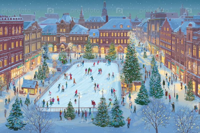 Зимняя лыжная сцена в окружении праздничных зданий и заснеженных деревьев