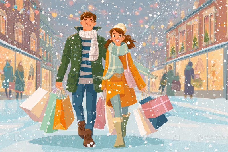 Молодая пара наслаждается зимними покупками вместе на праздничной улице с нежно падающим снегом