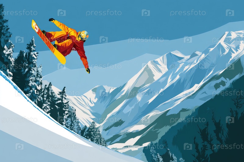 Сноубордист, одетый в ярко-оранжевое снаряжение, запечатлен на экране, выполняя трюк по снежным склонам, окруженный величественными горами и вечнозелеными деревьями, демонстрируя волнение зимних видов спорта