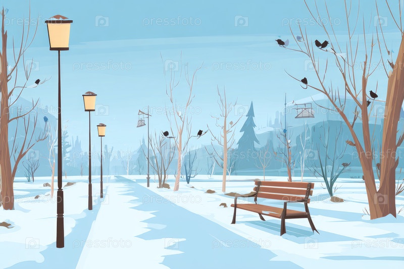 Зимняя сцена парка со снежно-заснеженной тропой, выложенной голыми деревьями и уличными фонарями, создает спокойную атмосферу с птицами, сидящими на ветвях, приглашая к мирному прогулке по природе