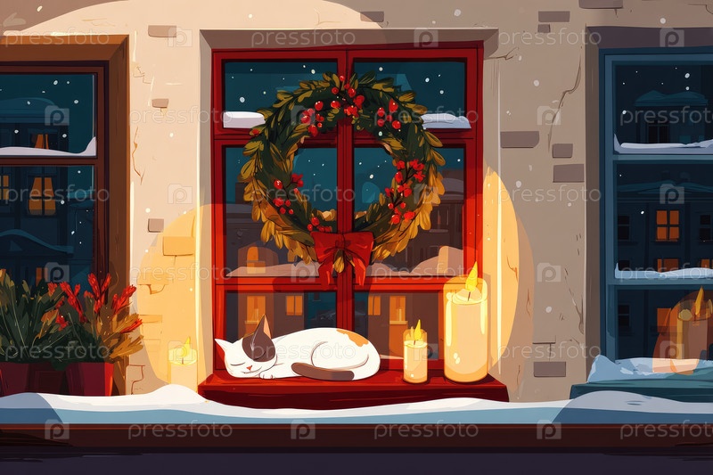 Уютная зимняя сцена со спящим котом на подоконнике, украшенной праздничным венком и светящимися свечами, создает теплую и гостеприимную атмосферу во время снежного сезона