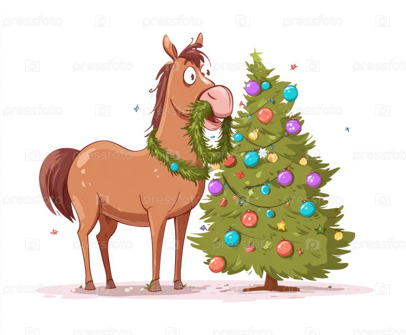 Мультипликационная лошадь игриво украшает рождественскую елку яркими декорациями и гирляндой, создавая веселую праздничную атмосферу, наполненную радостью и праздничным духом
