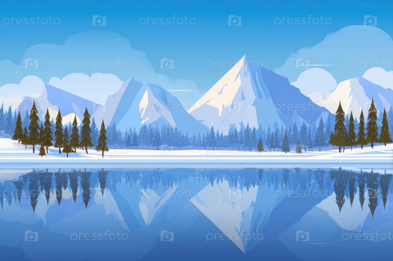 Живописный зимний пейзаж, показывающий величественные заснеженные горы и спокойное озеро, отражающее чистое синее небо в окружении вечнозеленых деревьев, создавая мирную атмосферу