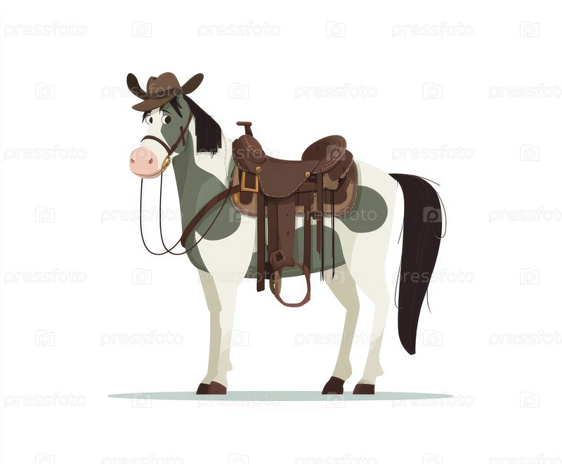 Мультипликационная лошадь в ковбойской шляпе и седле гордо стоит, демонстрируя свой игривый характер на ярких иллюстрациях, идеально подходящих для детских тем и западных приключений