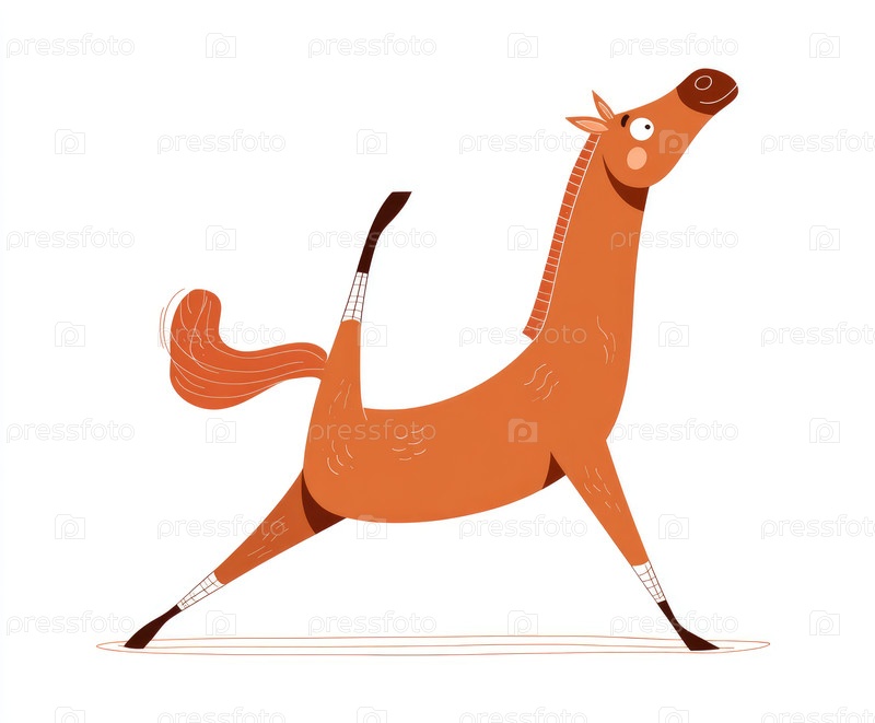 Игральная иллюстрация коричневой лошади имеет поднятую ногу и смешное выражение лица, демонстрируя причудливый дизайн с простыми линиями и яркими цветами, идеально подходящий для детских тем и повествования