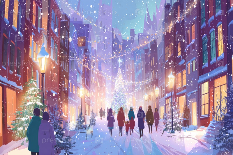 Зимняя уличная сцена, наполненная праздничными украшениями, мягко падающие снежинки и группы людей создают радостную атмосферу праздника с мерцающими огнями и вечнозелеными деревьями