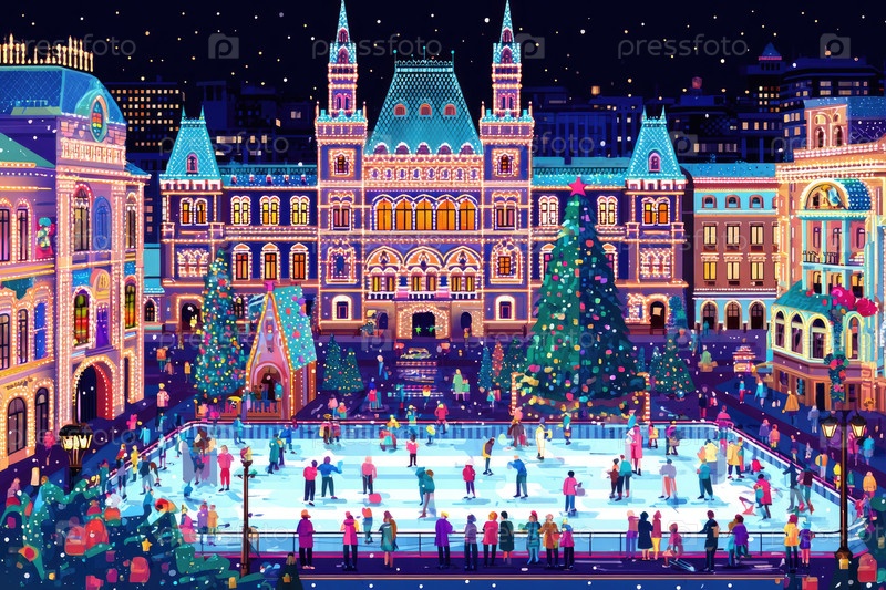 Живая зимняя сцена с катоком, окруженным праздничными огнями и декорациями, с радостными фигуристами, наслаждающимися праздничной атмосферой в шумной городской среде