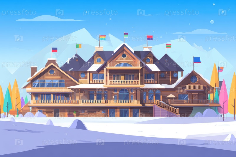 Иллюстрация зимнего дома с большой деревянной конструкцией, украшенной флагами, в окружении красочных деревьев и заснеженных гор, создавая спокойную и привлекательную зимнюю атмосферу
