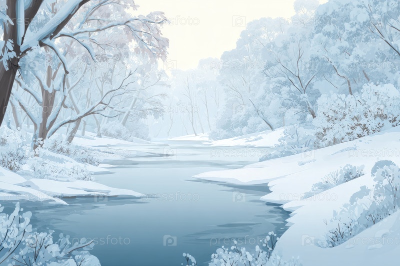 Безмятежный зимний ландшафт с спокойной рекой, извивающейся по снежному лесу, со замёрзшими деревьями и нежными холмами создает мирную атмосферу, приглашая к размышлениям и спокойствию