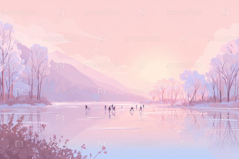 Иллюстрация пейзажа Серены с людьми, катающимися на коньках на замерзшем озере во время захода солнца зимой