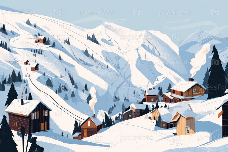 Иллюстрация зимнего пейзажа с уютными хижинами, расположенными в заснеженных горах со тропами