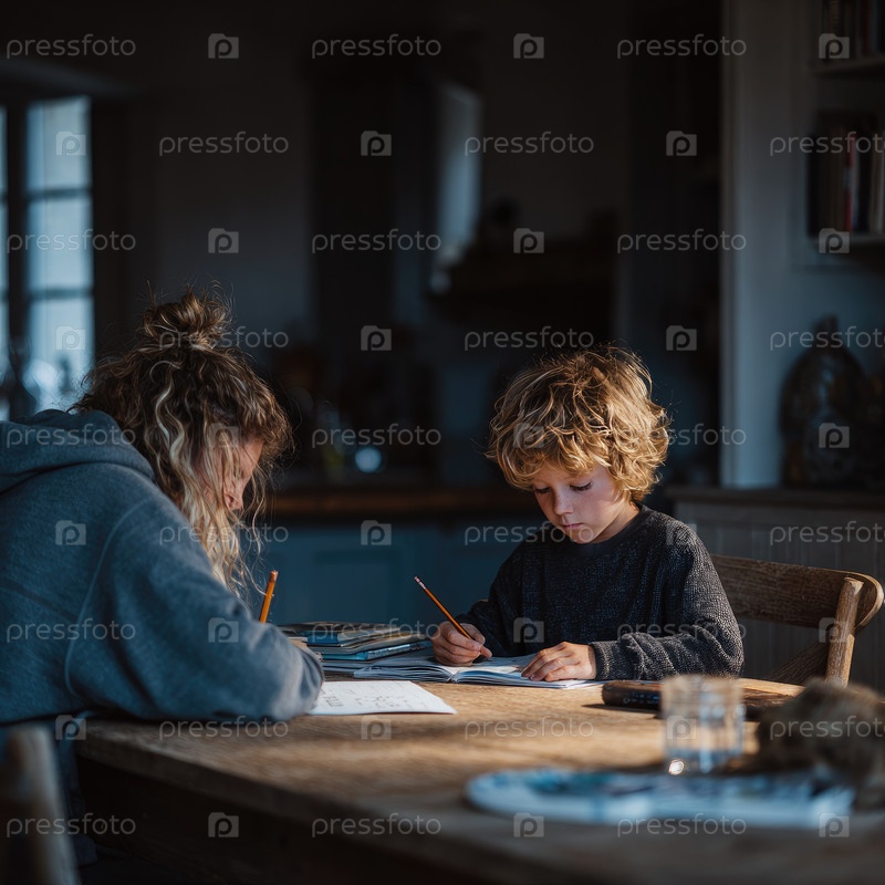 Женщина и ребенок занимаются творческим рисунком у деревенского деревянного стола с теплым освещением