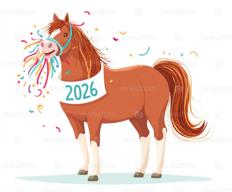 Веселая коричневая лошадь с красочной гривой и праздничными украшениями, отмечающая 2026 год