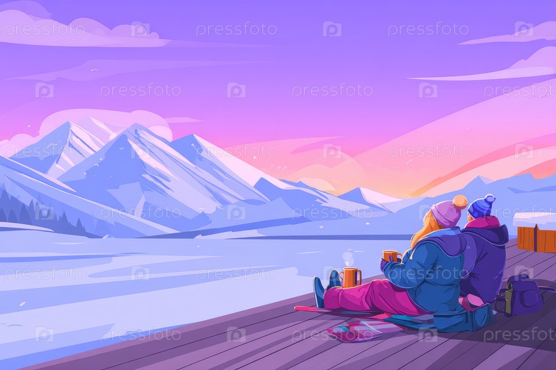 Пара наслаждается теплыми напитками на деревянной палубе с видом на заснеженные горы при закате