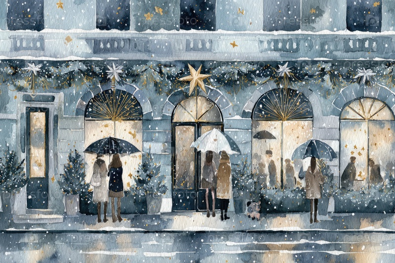 Зимняя сцена с людьми, держащими зонтики перед украшенным магазином во время снега