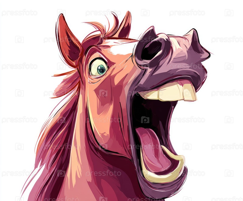 Красочная иллюстрация удивленной лошади с открытым ртом и выразительными глазами