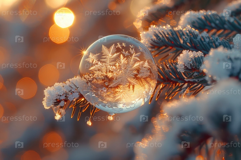Заснеженная сосновая ветвь с кристально чистым пузырем, отражающим зимние пейзажи и теплые огни
