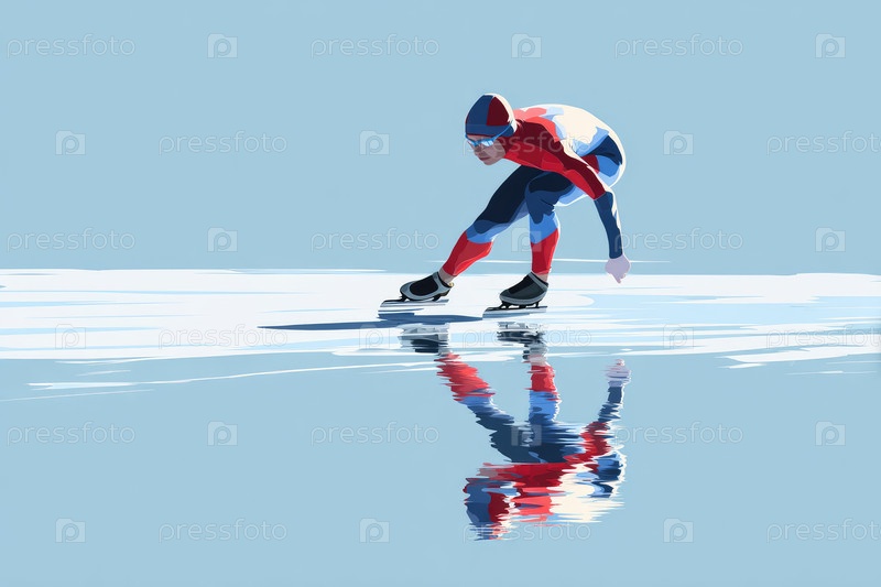 Скоростной фигурист в динамической позе скользит на гладкой поверхности льда с яркими отражениями