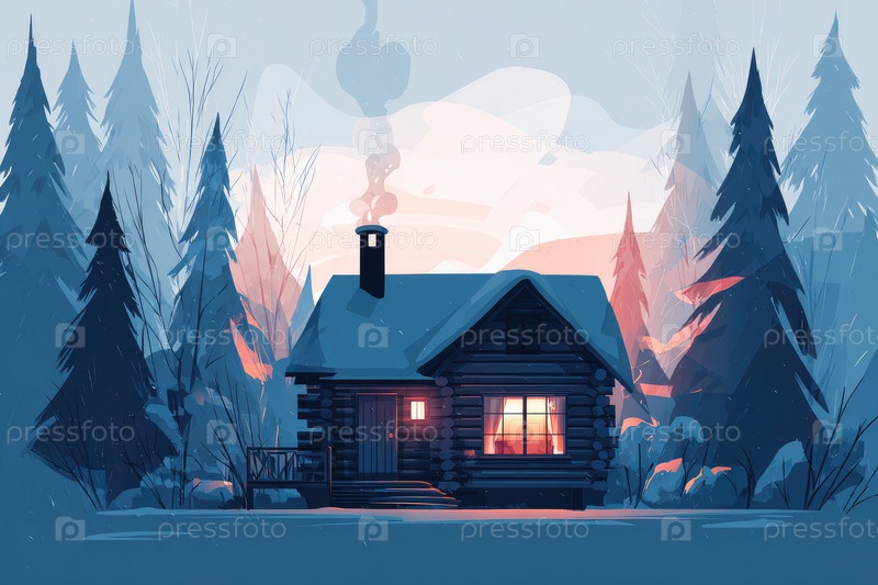 Уютный бревенчатый домик в снежном лесу с теплым светом, сияющим из окон на закате