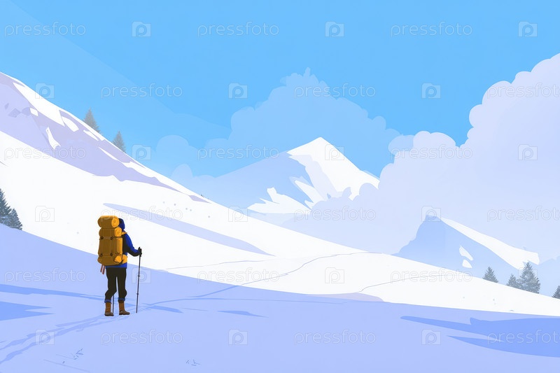 Приключитель в желтом рюкзаке, путешествующий по заснеженным горам с чистым синим небом