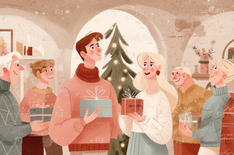 Группа друзей обменивается подарками в уютной обстановке в комнате с праздничными украшениями и деревом