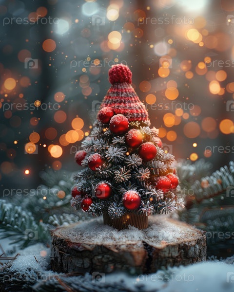Миниатюрная рождественская елка, украшенная красными драгоценностями и вязанной шляпой на деревянном конопли