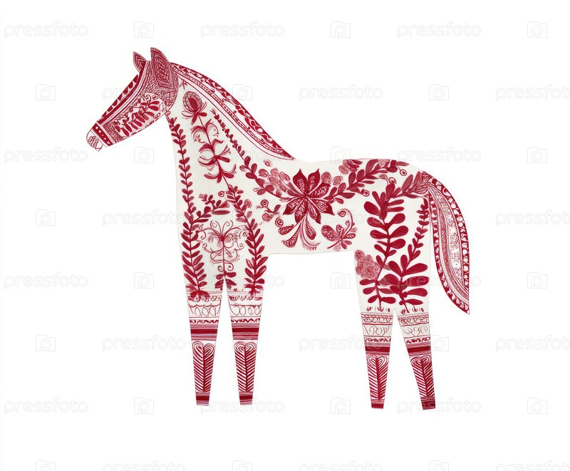 Декоративная иллюстрация лошади со сложными цветочными узорами в ярко-красных и белых цветах