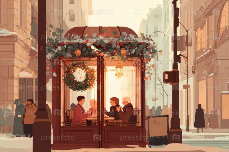 Уютная зимняя сцена кафе с друзьями, наслаждающимися теплыми напитками в праздничной атмосфере