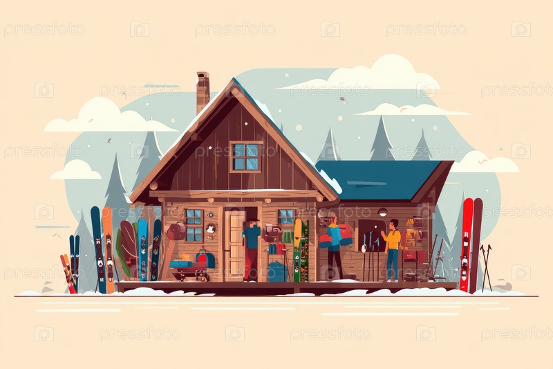 Уютный деревянный домик в снежном пейзаже с людьми, которые готовятся к зимним видам спорта